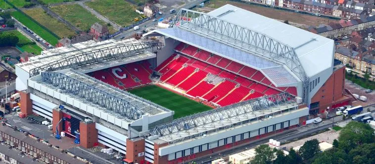 Which Premier League club plays at Anfield, home of the Kop stand?